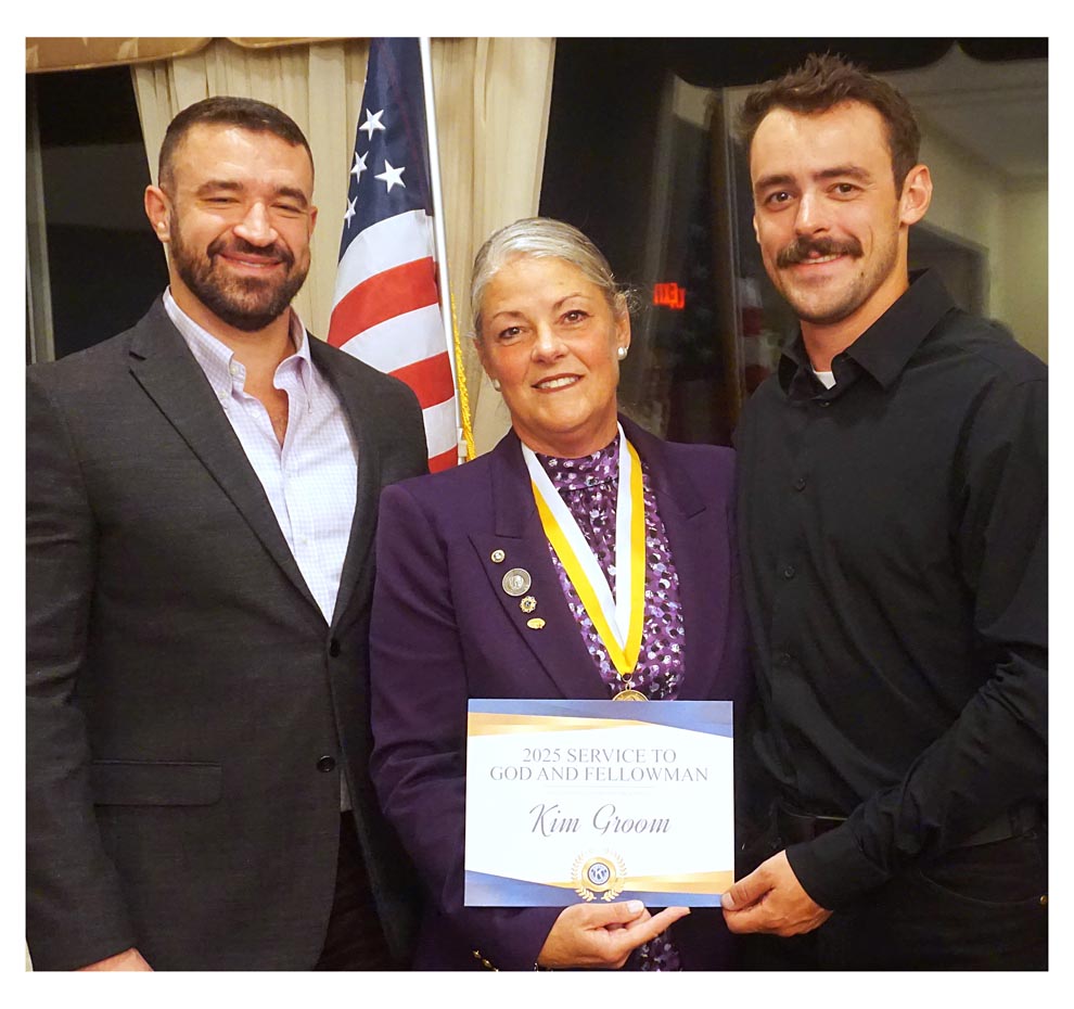 Kim Groom, center, receives the Kiwanis Club of Aurora 47th Annual God & Fellowman award at Aurora Country Club September 30.
