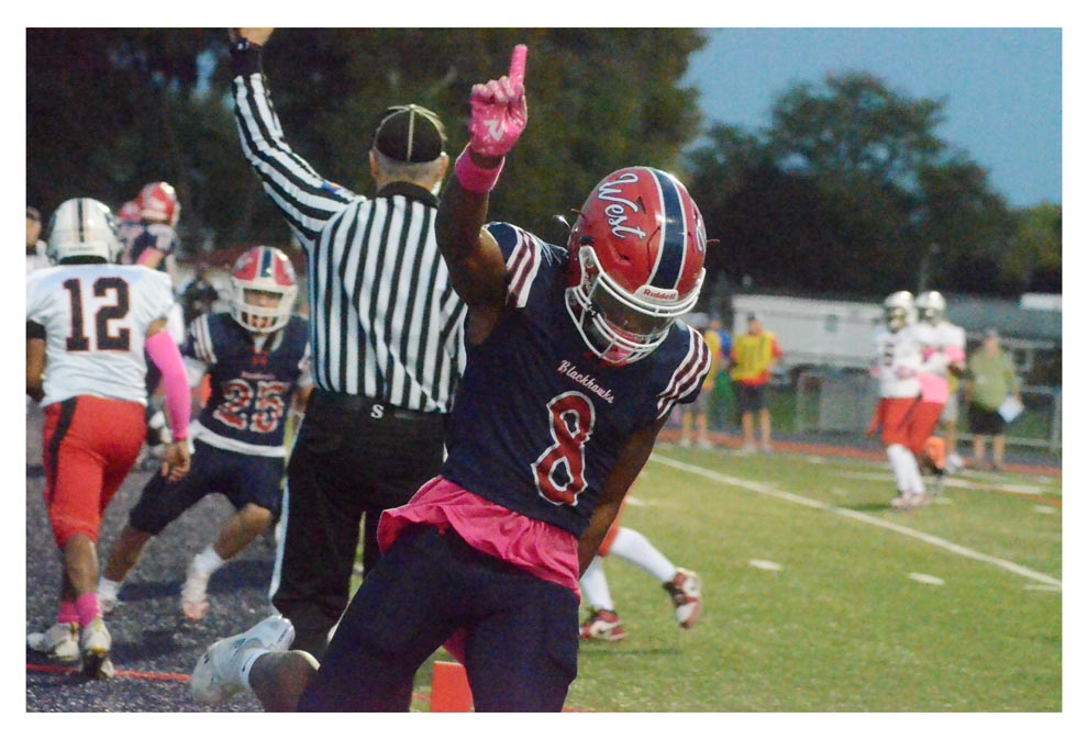 West Aurora High School’s Bryce Riley (8) celebrates a first quarter touchdown against East Aurora Friday, Oct. 17.