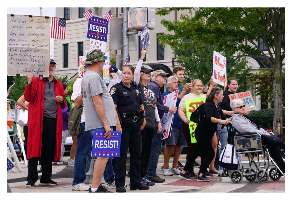 No Kings protestors assembled Saturday, Oct. 18 in Naperville to demonstrate against Donald Trump allegedly acting like a monarch and his administration.