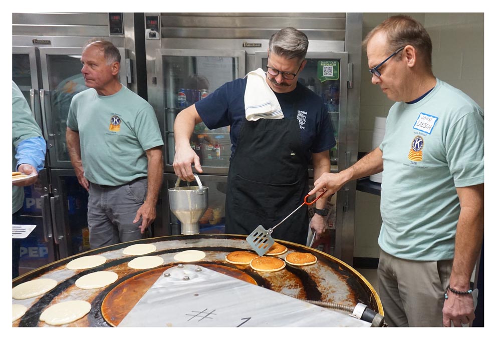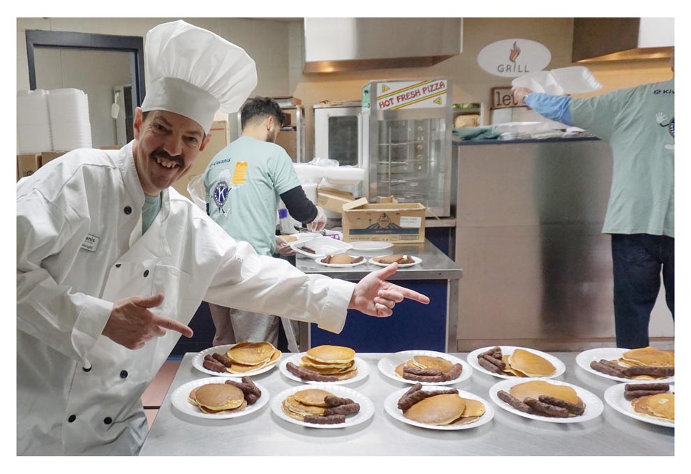 Kiwanis Club of Aurora president and main chef, Lucas Albright, points at the many pancakes and sausages to be served at the 75th Annual Kiwanis Club of Aurora Pancake Breakfast, March 14 at Aurora Central Catholic High School. Approximately 700 individuals attended the breakfast. John Ross photoKiwanis Club of Aurora volunteers cook pancakes for the 75th Annual Kiwanis Club of Aurora Pancake Breakfast, March 14 at Aurora Central Catholic High School. Mayor of Aurora, John Laesch, right, flips pancakes. John Ross photo