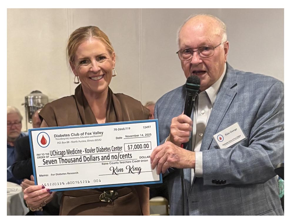 Russ George, president of the Diabetes Club of Fox Valley came to the podium and spoke briefly about the diabetes epidemic we’re facing in our country. He then called upon Peggy Hasenauer, executive director, from UChicago Medicine-Kovler Diabetes Center to come forward to accept a $7,000 check, from the Diabetes Club of Fox Valley for diabetes research, bringing this year’s Diabetes Club contributions for research at Kovler to $10,000. President George, stated “UChicago Medicine’s Kovler Diabetes Center has been leading the way in research, to find a cure”.