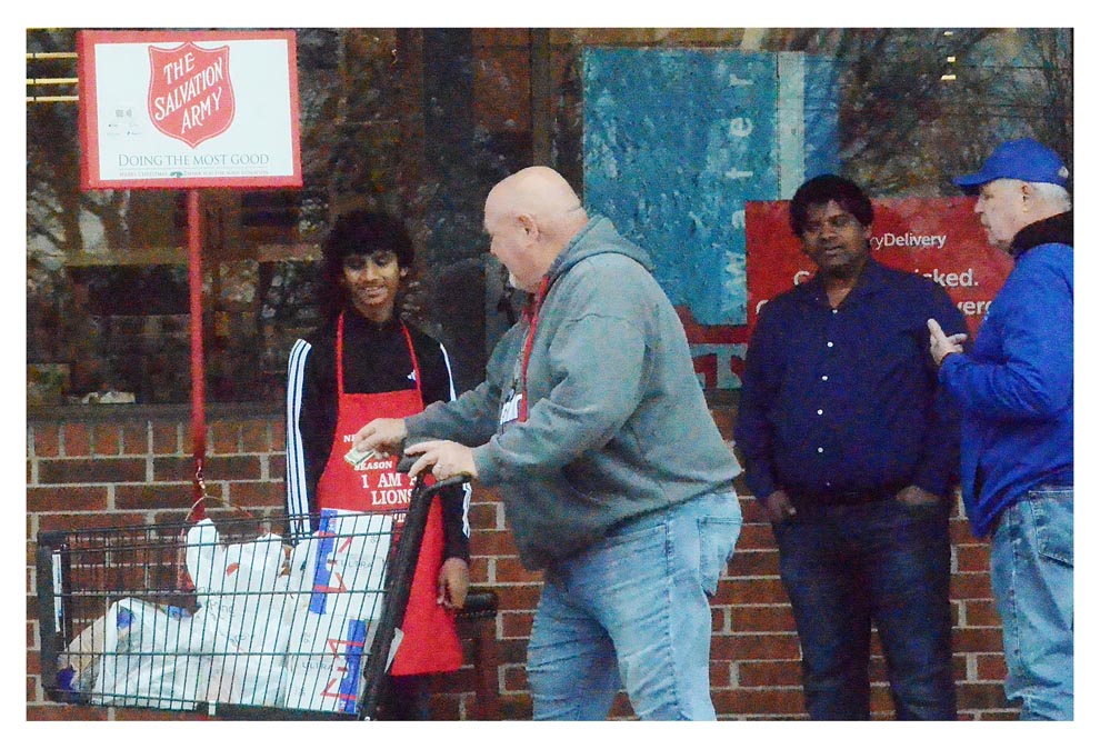 Nicholas Sookoo of Aurora, 14, background from left; his father, Vinood Sookoo; and Jay Short, Aurora Lions Club first vice president, collect donations for the Salvation Army Aurora Corps Red Kettle campaign. Lions’ volunteers were bell ringers outside the Jewel-Osco store in west Aurora. Aurora Lions Club members and friends helped raise $1,515 in Salvation Army Aurora Corps’ 2025 Red Kettle drive. Al Benson/The Voice