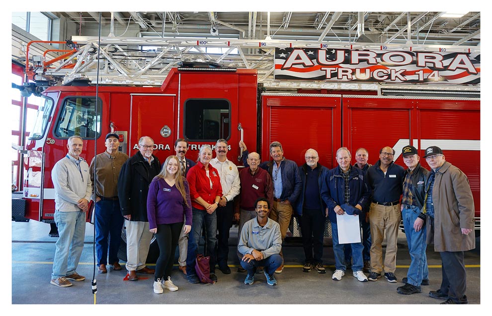 Kiwanis Club of Aurora members pose in front of a firetruck during a tour of the Aurora Fire Department Station 13 February 3.