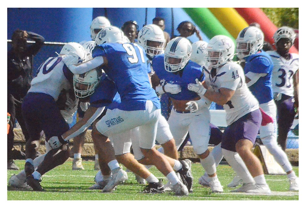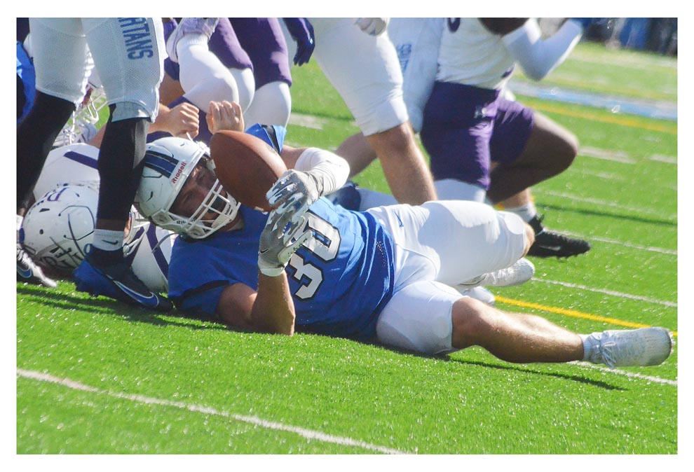 Aurora University players stop a run by Rockford University’s William Key (10) Saturday, Oct. 11. Host Aurora won, 48-0, during its homecoming game. Aurora will next play at home against Concordia University Wisconsin at 1 p.m. Saturday, Oct. 18.Al Benson/The VoiceAurora University’s Isaac Kaster (30) grabs for a loose ball against Rockford University Saturday, Oct. 11. Host Aurora won, 48-0, during its homecoming game. Aurora will next play at home against Concordia University Wisconsin at 1 p.m. Saturday, Oct. 18.Al Benson/The Voice