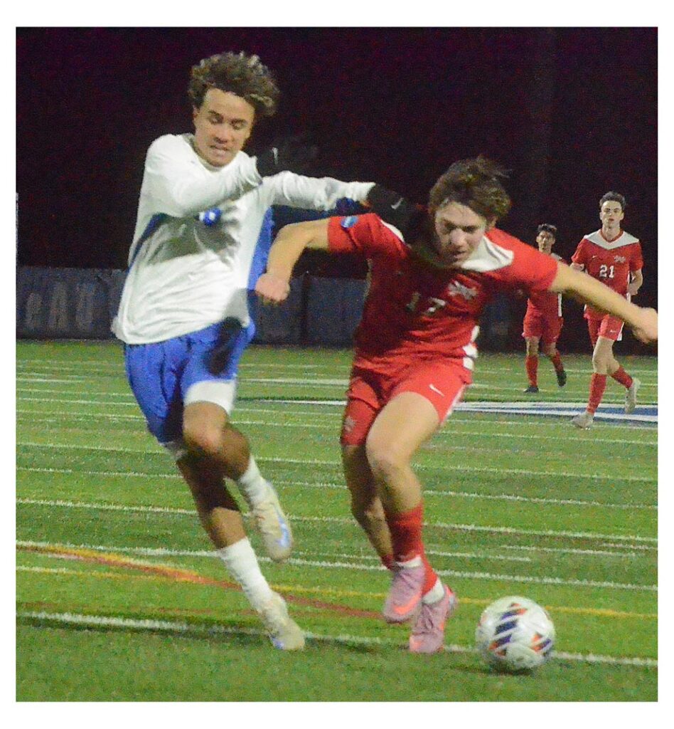 Aurora University’s Jorge Morales (16), left, is in a battle with Milwaukee School of Engineering’s Lachlan Ladd (17) during the NACC championship playoff game at Aurora Friday, Nov. 7. Milwaukee won, 1-0. Aurora men’s soccer team finished the season 13-4-3 overall and 10-1-1 in the NACC for second place. Al Benson/The Voice