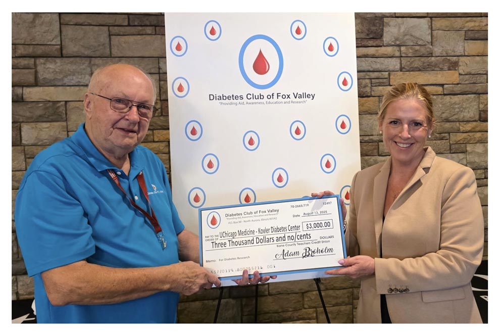 Russ George, president of the Diabetes Club of Fox Valley, left presents Peggy Hasenauer, executive director, from UChicago Medicine-Kovler Diabetes Center, with a $3,000 check for diabetes research. Kim King photo