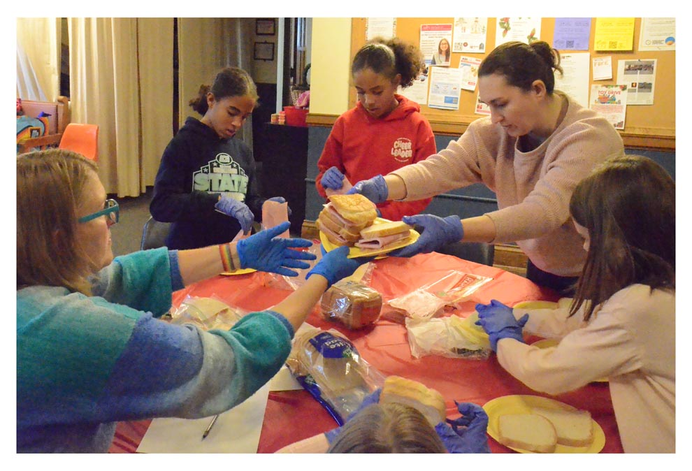 Sarah Swanson of Aurora, right, hands reverend Tammy Scott sandwiches for Aurora’s Community Fridge Project. Background are Hannah and Haylee Scott of Oswego. Rev. Scott, lead pastor at Wesley United Methodist Church in Aurora, and volunteers kicked off a two-Sunday post-worship sandwich-making drive for fridges that serve hungry people 24/7. Al Benson/The Voice