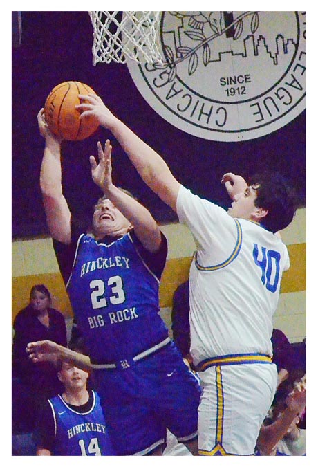 Aurora Central Catholic High School’s Braden Dillon (40) blocks Hinckley-Big Rock’s Luke Badal (23) February 9. Visiting H-BR won, 65-55. Al Benson/The Voice