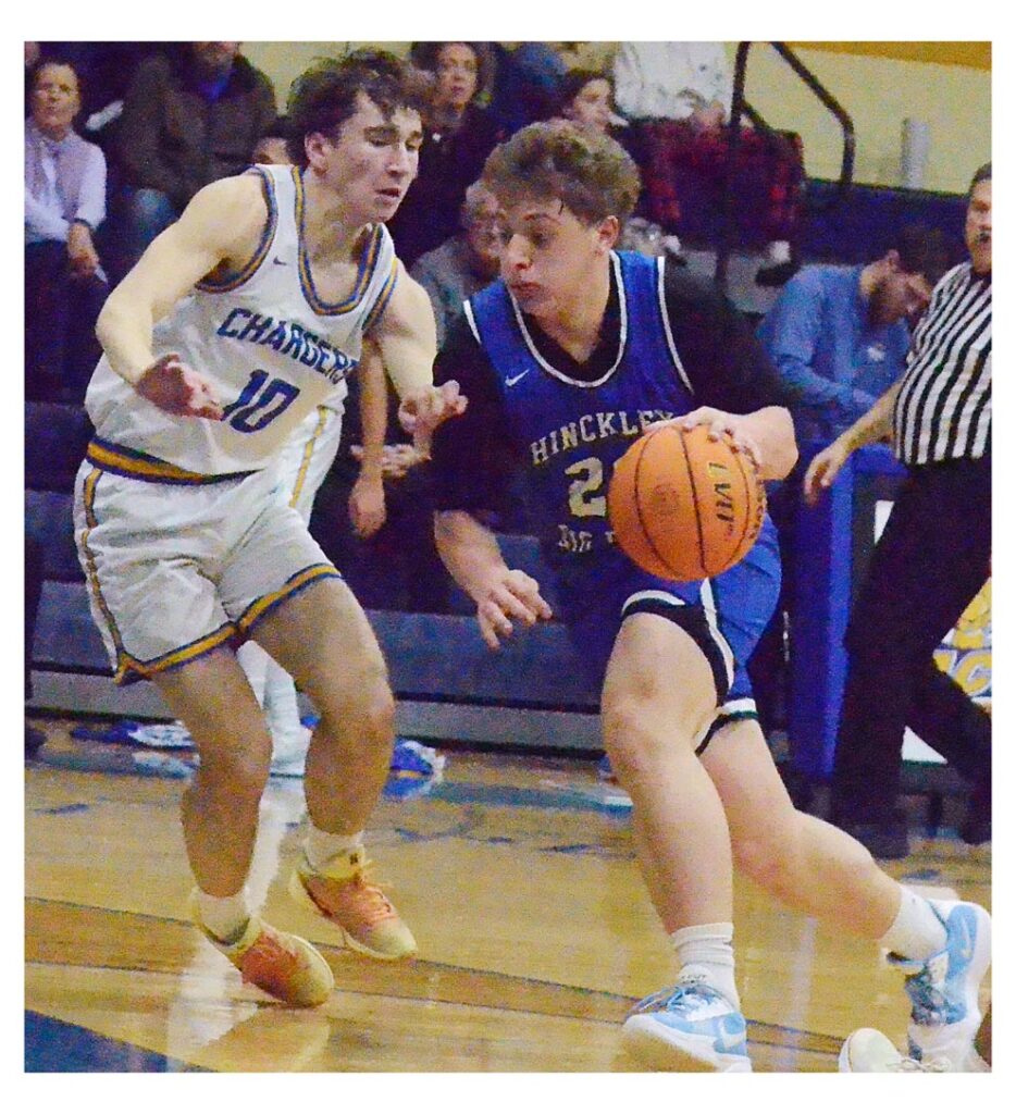 Hinckley-Big Rock High School’s Luke Badal (23) drives against Aurora Central Catholic’s Jack Swiatek (10) February 9 in Aurora. Visiting H-BR won, 65-55. Al Benson/The Voice