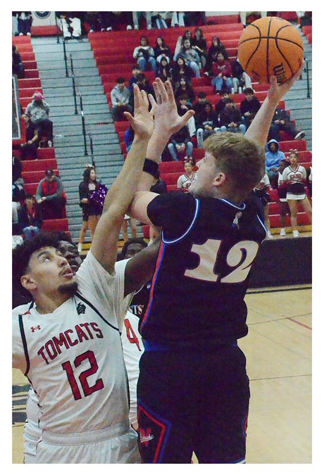 West Aurora High School’s Drew Lundberg (12) shoots over East Aurora’s Yurem Horta (12) February 5. Visiting West Aurora won, 59-48. Al Benson/The Voice