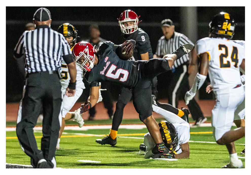 Yorkville High School’s Gavin Geegan (34) gains yards against Joliet West Friday, Sept. 5. Host Yorkville won, 27-13. Yorkville will next play at home against Minooka Friday, Sept. 12 at 7 p.m..Steve Groth photoYorkville High School’s T.J. Harland (5) is wrapped up at the ankles and stumbles forward against Joliet West Friday, Sept. 5. Host Yorkville won, 27-13. Yorkville will next play at home against Minooka, Friday, Sept. 12 at 7 p.m.. See page 10. Joliet West will next play at home against Plainfield South, Friday, Sept. 12, 6:30 p.m..Steve Groth photo