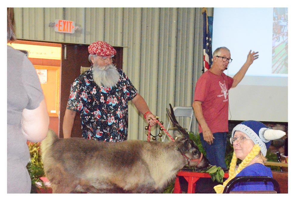 Nova the reindeer munches on willow leaves with handler Joe “Santa” Steffen of Newark and Randy Espy, owner of Whispering Pines Reindeer Ranch and Christmas Tree Farm in Shabbona. Espy discussed “Reindeer in Illinois” during a weekend celebration of 200 years of Norwegian immigration to America. Right is attendee Lisa Nelson of North Aurora.Al Benson/The Voice