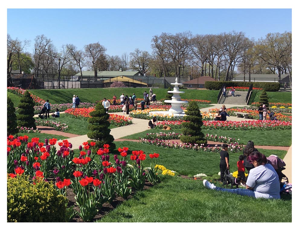 Thousands of tulips were in bloom at the Sunken Garden in Phillips Park in Aurora on the beautiful spring day, Sunday, April 27. By mid-May, each year, the tulips are removed and replaced with flowering annuals for the Garden’s Summer display. The original 60 acres for the Park were donated to the City by the estate of Travis Phillips in 1899. Jason Crane/The Voice