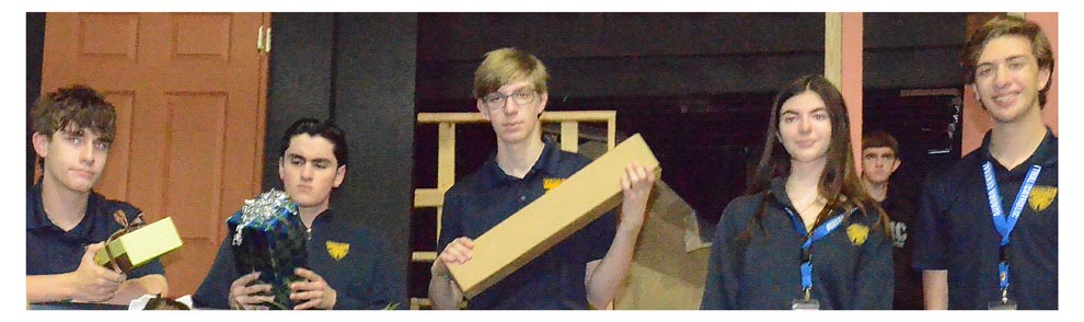 Aurora Central Catholic High School students pose for a photo during rehearsals for “Clue” at ACC November 7-8.