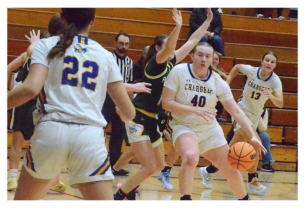 Aurora Central Catholic High School’s Ashley Watter (40) drives against Plainfield Central defenders November 24 in the West Aurora Turkey Tournament.