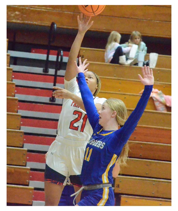 Oswego High School’s Jordyn Parnell (21) shoots over Aurora Central Catholic’s Annalyse McCarty (11) November 25, in the West Aurora Turkey Tournament.