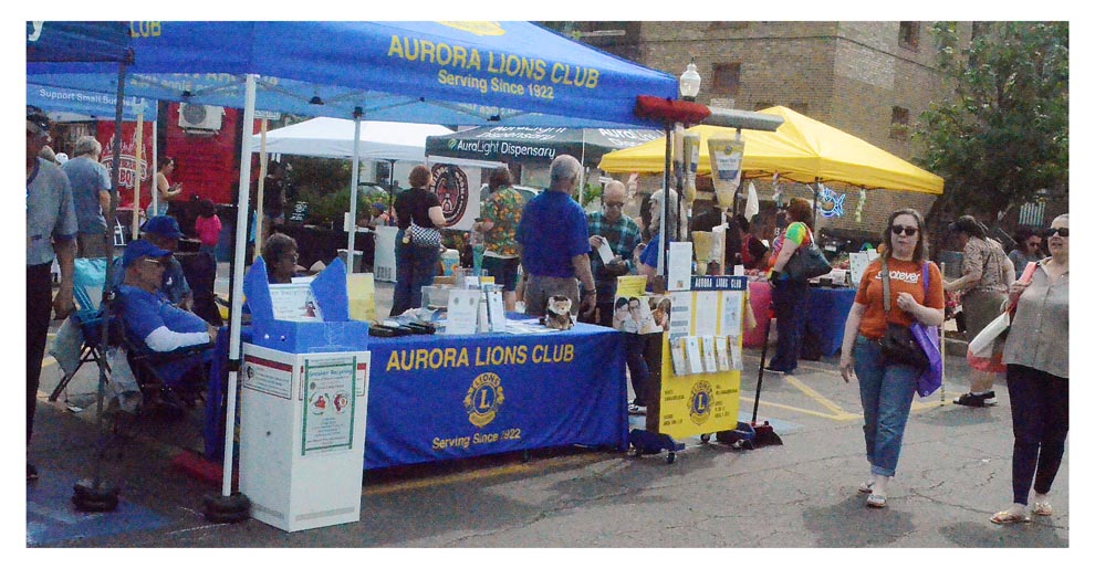 Aurora Lions Club was among 70 vendors at the 114th annual Aurora Farmers Market which opened Saturday morning, June 7, at Water Street Square in downtown Aurora. Aurora Lions offered information and collected sneakers and eyeglasses for recycling. The oldest in Illinois, the Aurora market will continue from 8 a.m.