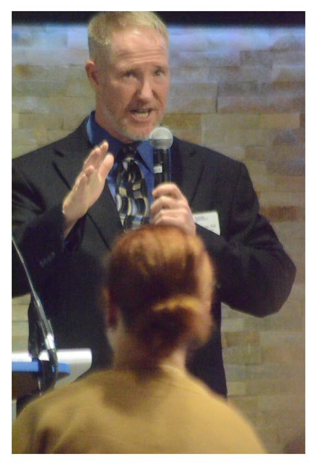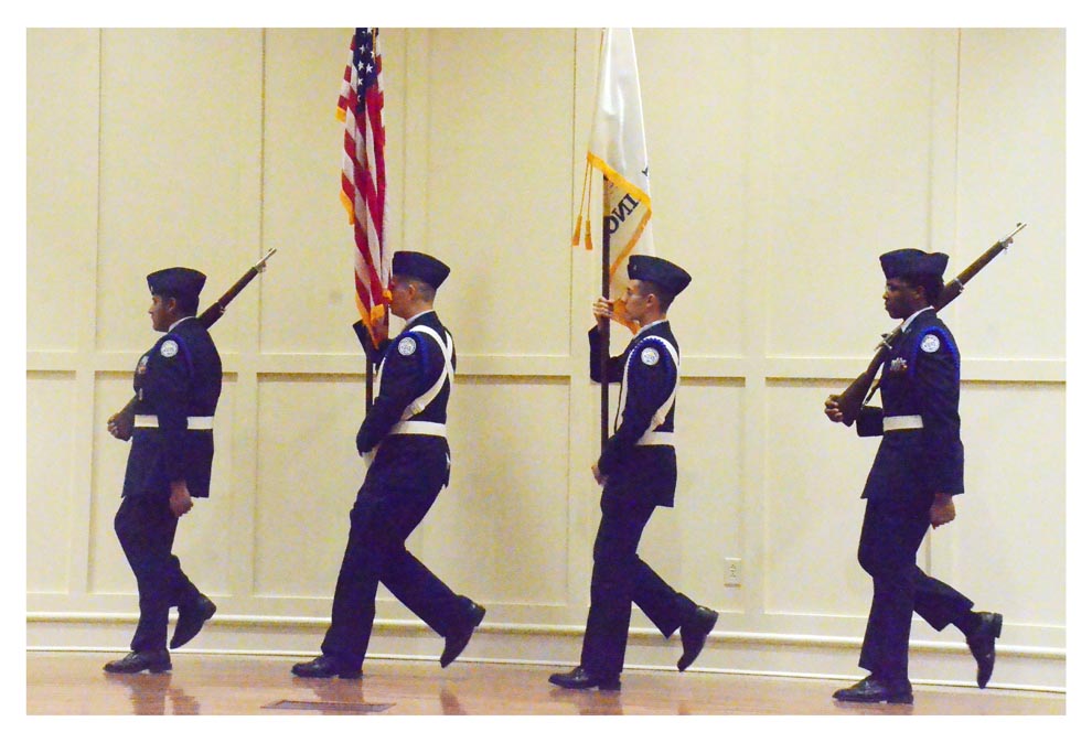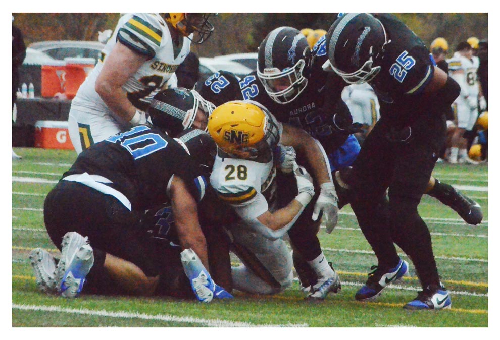 Aurora University’s men’s basketball team and friends celebrate the Spartans’ 67-66 win over visiting Marian University February 28 in the Northern Athletics Collegiate Conference tournament.