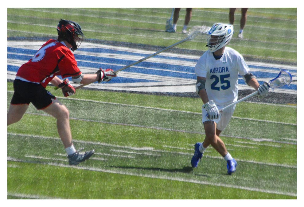 Aurora University lacrosse midfielder, Owen Spencer, (25) looks to pass Saturday, April 26 against an Edgewood College defender at Spartan Athletic Park in Montgomery.