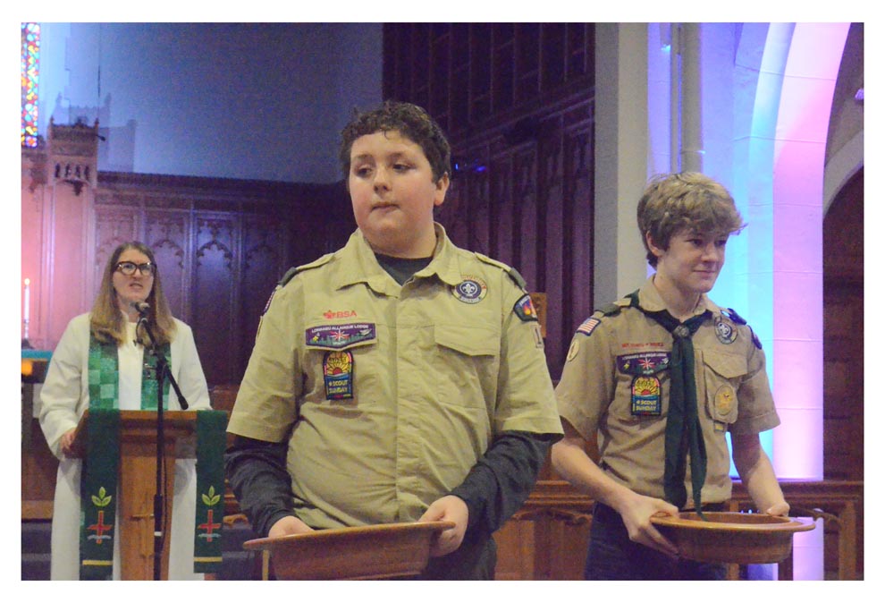 Aurora Boy Scouts Charlie Rendall, left, and Andrew Banach pass collection plates during annual Scout Sunday, Feb. 2 at Aurora’s Wesley United Methodist Church.