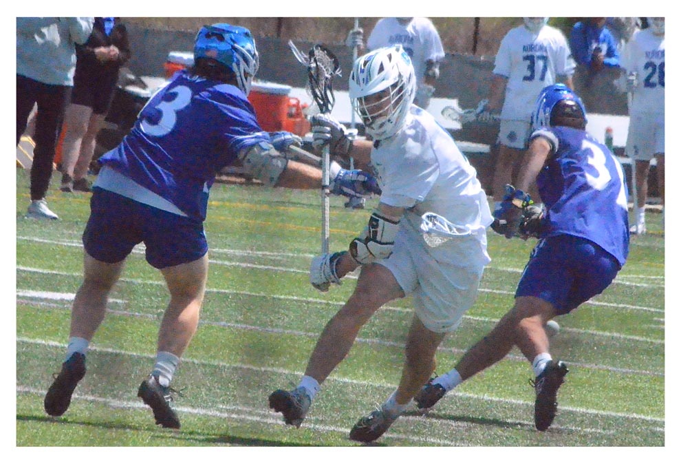 Aurora University attacker, Tyler Foerstel, center, drives between Concordia Wisconsin defenders Saturday, May 3.