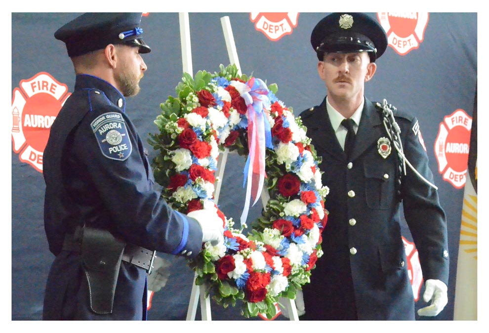 Aurora firefighters lay a wreath Thursday, Sept. 11 at Aurora’s annual 9-11 memorial ceremony at the Aurora Central fire station.