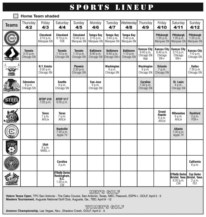 SportsSportsSports LineupLeave a comment Sports Lineup April 2 through April 12 On March 31, 2026March 31, 2026 By admin
