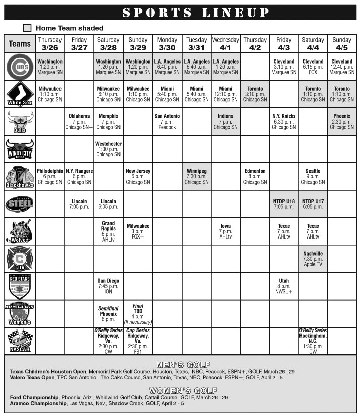 SportsScheduleSportsSports LineupLeave a comment Sports Lineup March 26 through April 5 On March 24, 2026March 24, 2026 By admin