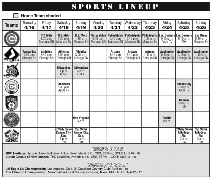 SportsScheduleSportsSports LineupLeave a comment Sports Lineup April 16 through April 26 On April 14, 2026April 14, 2026 By admin