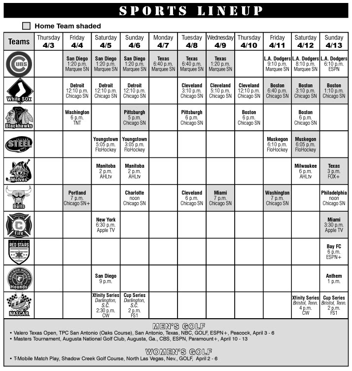 SportsScheduleSportsSports LineupLeave a comment Sports Lineup April 3 through April 13 On April 1, 2025April 1, 2025 By admin