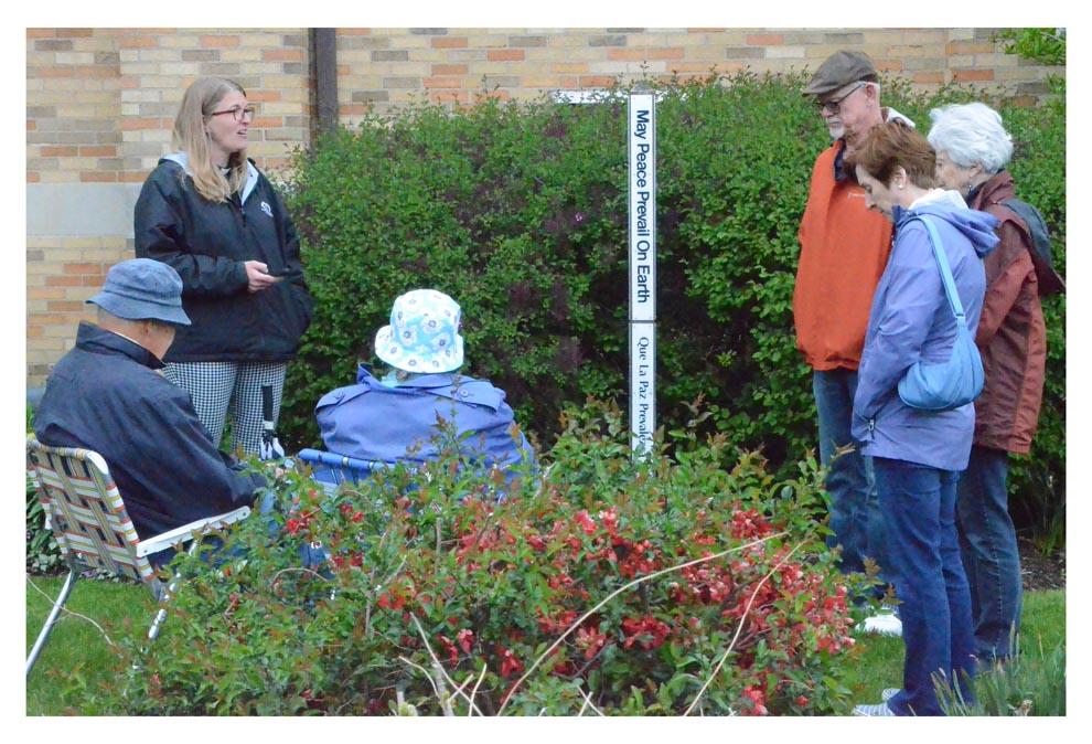 Reverend Tammy Scott, left, leads prayers Thursday, May 1 in the peace garden at Wesley United Methodist Church in Aurora.