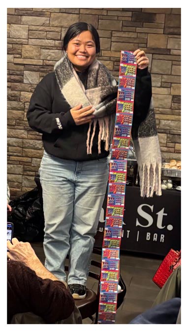 Diabetes Club of Fox Valley member, Hlawn Tlang, a student at Aurora University, holds up the gift she picked, a string of Illinois lottery tickets, at the Club’s annual holiday party, December 13, at Oak Street Restaurant, in North Aurora. Submitted photo