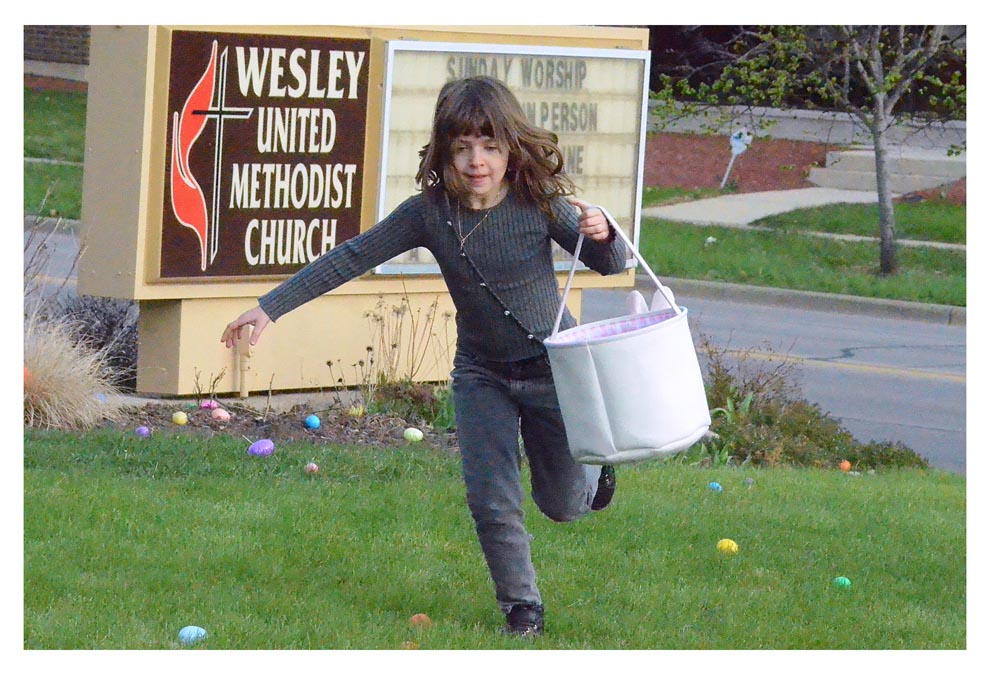 Laura Daranuta, 7, of Aurora, runs to scoop up plastic eggs in an outdoor Easter egg hunt April 16, at Wesley United Methodist Church in Aurora.Al Benson/The Voice
